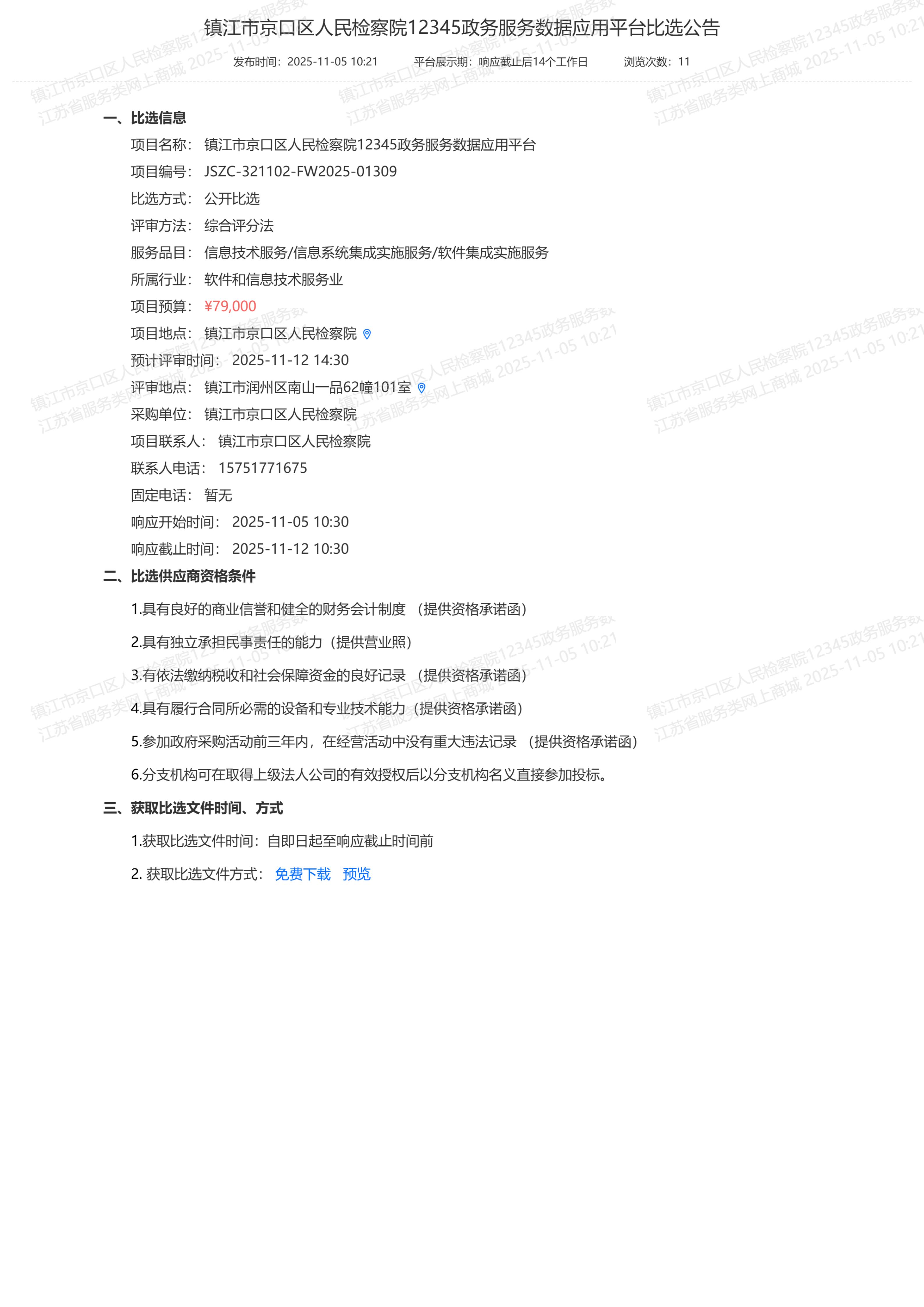 参加地址:https://js.fwgov.cn/biddingAnnouncement/1985895133182652417?type=2&serviceType=1&name=required京口区人民检察院12345政务服务数据应用平台比选公告